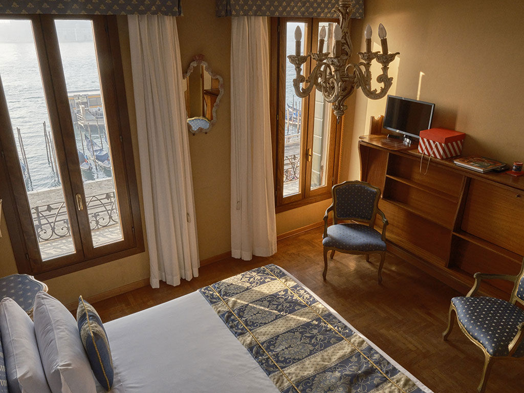 Le nostre Camere Superior, di 21 m², offrono una vista mozzafiato sul Bacino di San Marco e sulla laguna. Dalle due finestre potrete ammirare l’isola di San Giorgio, la Giudecca e la Chiesa di Santa Maria della Salute, in uno scenario che cambia delicatamente con il ritmo della luce.